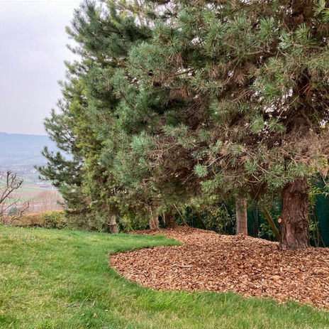 Création d'allées sur un terrain en pente et mise en place d'un paillage en copeaux de bois au pieds des arbres.